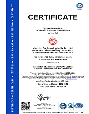 Castfab Engineering India (P) Ltd., established in the year 2000, is an ISO 9001:2015 certified company engaged in the manufacturing of high-quality aluminium castings and industrial sub-assemblies. The company is located in Coimbatore, South India. Coimbatore is one of the fastest-growing cities in the country and is well connected by road, rail, and air to major cities across India and abroad. Additionally, it is within a few hours’ drive of key seaports, enhancing its strategic connectivity.